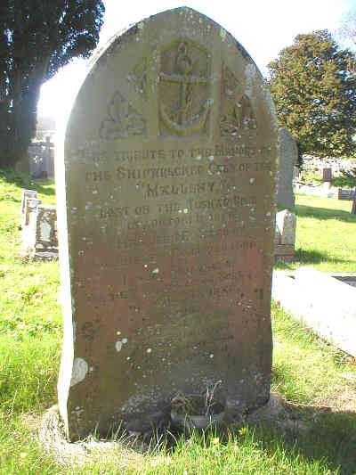 Portuguese vessel Malleny was an iron ship bound for Rio with a cargo of Welsh coal. It was lost with all hands (20 crew) on or around 14th October, 1886 when she hit Tuskar (Tusker) Rock. Bodies of the seamen were washed up on the shore at Southerndown, Marcross and St. Donats, and gravestones were erected in the churchyards where they were buried, including St. Bridget's. Carpenter Edwin Waters had been paid off at Amsterdam on 8th September, 1886, a fact which was not yet known to his family in Appledore, Devon, so that when he arrived home they were all in mourning and wearing black. The name-plate of the Malleny was washed up at Westward Ho! in Devon* and his grandson bought it for five shillings and took it home. The remains of the ship between the rock and the shore could still be seen until 1979 when they were blown up by the military.